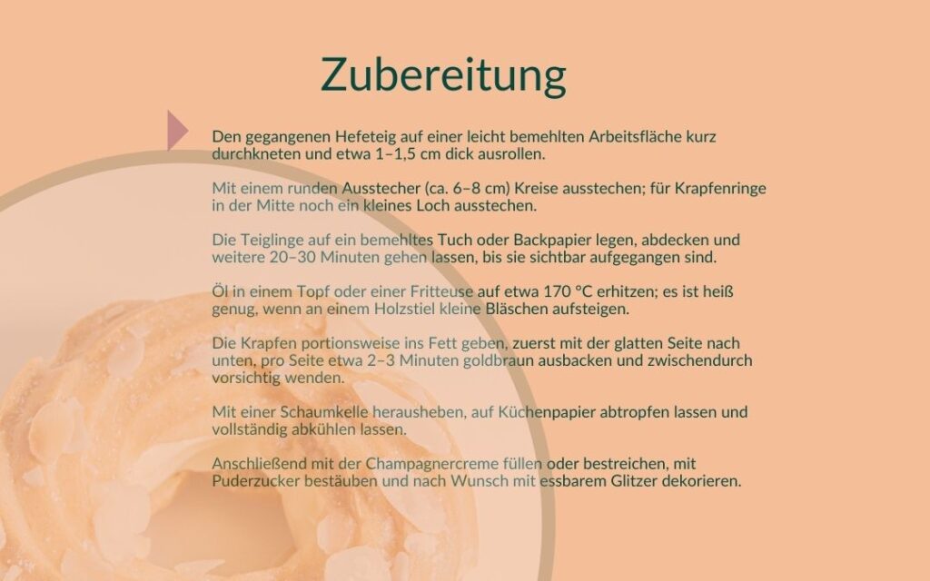 Kurz vor dem Servieren füllst du die Krapfen mit der Champagnercreme oder setzt Tupfen darauf und bestreust sie mit Puderzucker – so bleiben sie innen frisch und außen knusprig. Diese Krapfen passen ideal zu Silvester, Geburtstagen oder jedem Anlass, an dem ein Glas Champagner ohnehin schon bereitsteht.